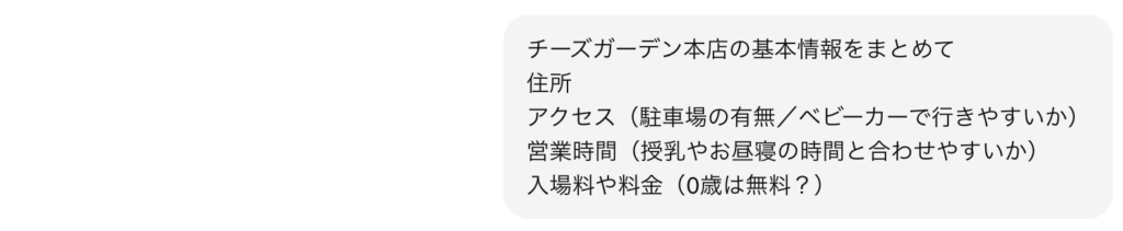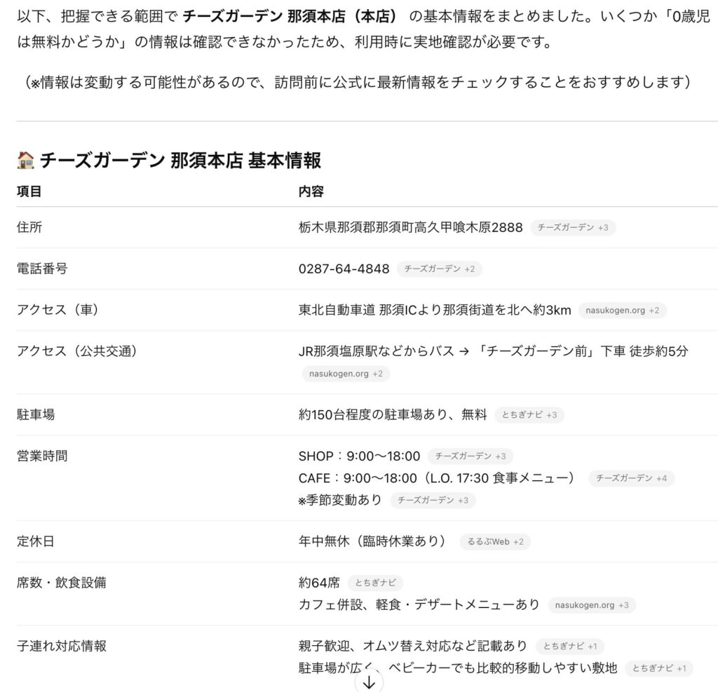 実際の例として、先日訪れたチーズガーデン那須本店の情報をChatGPTにまとめてもらいました。
